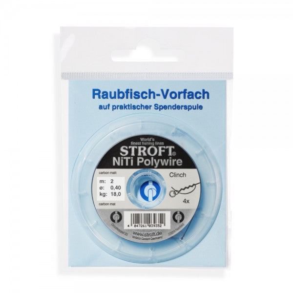 The new NiTi predator leaders from Stroft solve the well-known problems with leader lines of this type, as they can still be knotted even with larger diameters, thus bypassing a connection with crimp sleeves and increasing the carrying capacity by preventing slipping or tearing due to sharp edges. When knotted with a clinch knot, a maximum load capacity of up to 100% of the linear load capacity can be achieved. Note: The NiTi Monowire leaders are basically stiffer than the NiTi Polywire leaders braided from several single lines. The Niti Polywire leaders are braided from 1x3 single lines (0.20mm 3.10kg) or 1x7 single lines.